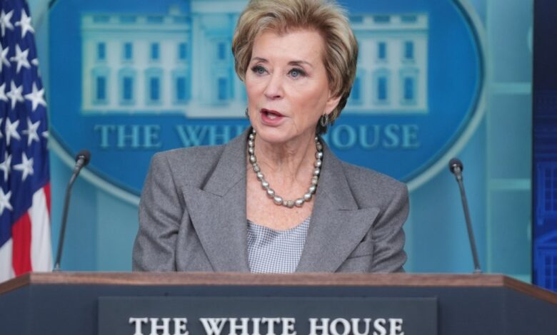 Ministr školství Linda McMahon mluví během tiskové konference v Bílém domě.Evan Vucci/AP