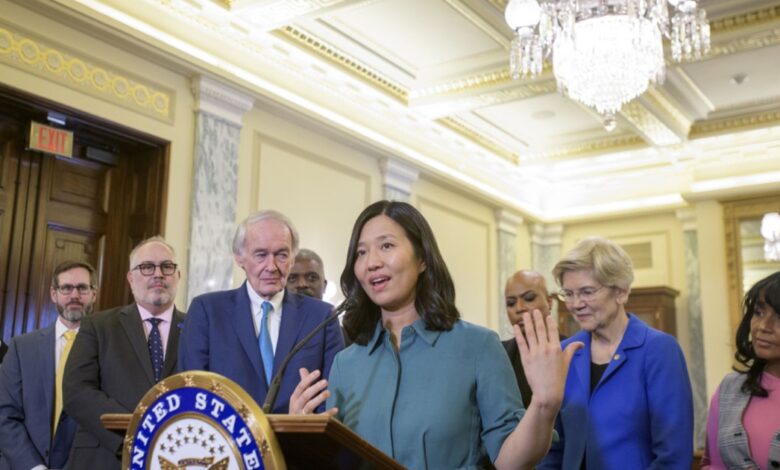 Bostonská starostka Michelle Wu hovoří během tiskové konference delegace kongresu v Massachusetts.Rod Lamkey/AP