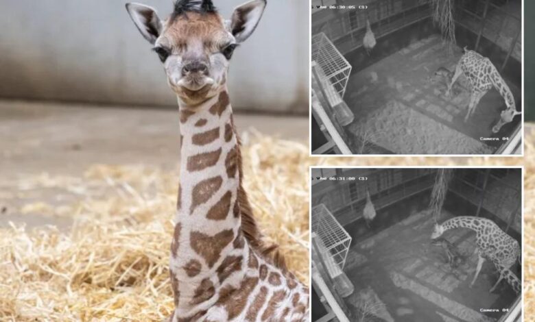Potěšující CCTV zachytil okamžik, kdy se narodilo vzácné mládě žirafy předtím, než udělala své první vratké krůčky v britském safari parku.