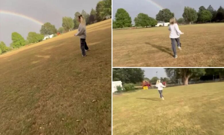 Video ukazuje, jak sestry vzrušeně běží směrem k duze.