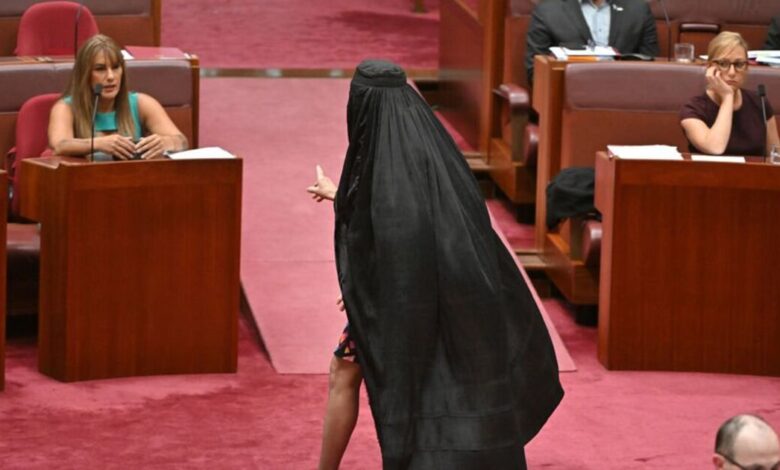Debata k zakázat zahalování celého obličeje upadl do chaosu poté, co vůdce pravicové politické strany vstoupil do sálu v burce. Pauline Hanson, vůdkyně australské strany Jeden národ, snažila předložit návrh zákona, který by zahaloval celoobličejové zahalování celostátní, což je politika, kterou dlouhodobě prosazuje.