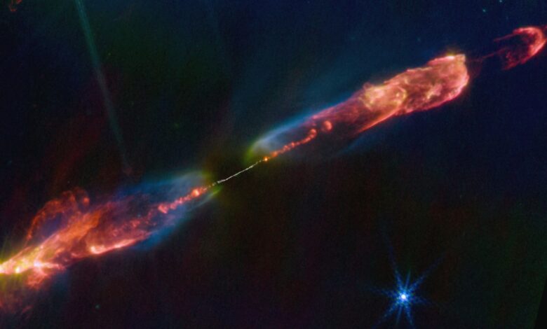 Na spektakulárním snímku zachycuje barevné zobrazení bipolárního výtrysku Vesmírný dalekohled Jamese Webba (JWST) v blízkých infračervených vlnových délkách. Výhled JWST je však blokován hustým prachem obklopujícím centrální oblast.