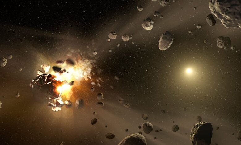 Přesto dělat Interakce, pokud jim je dáno dost času. Dokonce i v rozlehlém hlavním asteroidním pásu mezi oběžné dráhy Marsu a Jupiteru jsou kolize nevyhnutelné. Ve skutečnosti se nám to podařilo vidět Některé malé asteroidní rozbití;; Větší horniny jsou mnohem vzácnější, takže větší kolize jsou úměrně méně běžné. Stále se však stávají také – průzkum velkých asteroidů v průzkumu velkých asteroidů ukazuje, že jsou protkány starodávnými krátery dopadu. A když v hlavním pásu dva kosmické skály jdou „narážet“, jejich vysoká orbitální rychlost znamená, že kolize může dojít při rychlostech mnohem vyšší než u pušky. Šrapnel je nevyhnutelný, protože velké dopady vyhodí do vesmíru spoustu asteroidních nemovitostí.