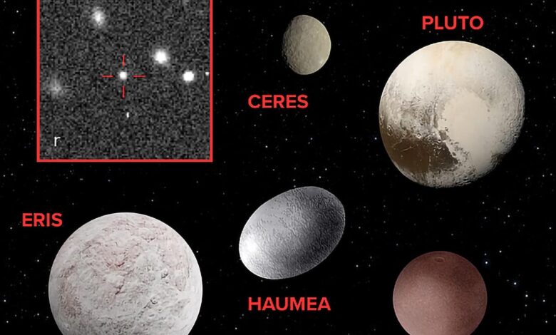 Kompozitní obraz ukazující pět trpasličích planet uznaných Mezinárodní astronomickou unií plus nově objevený trans-neptunský objekt 2017 OF201. Kredit: NASA/JPL-Caltech; Obrázek 2017 OF201: Sihao Cheng et al.