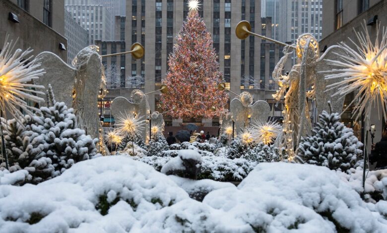 Pohled na vánoční strom v Rockefellerově centru, když 21. prosince 2024 padá sníh v New Yorku.