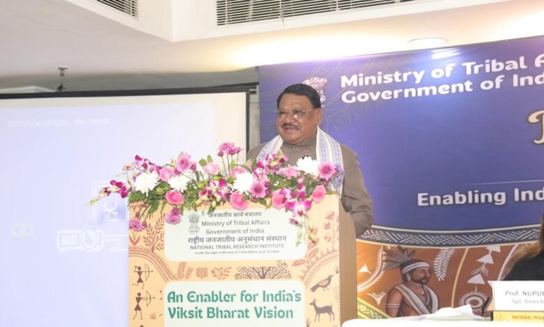 Ministr odborů pro kmenové záležitosti Jual Oram hovoří během Národního poradního semináře k zákonu o lesních právech (FRA), 2006 v New Delhi dne 19. prosince 2025. Foto: X/@TribalAffairsIn