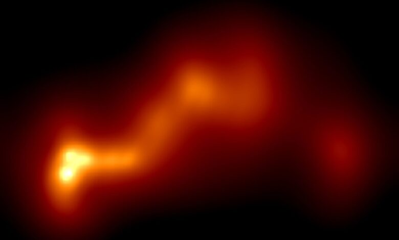 Podrobný obrázek odhaluje neobvyklý plazma Struktura proudu, což naznačuje přítomnost dvou sloučení černých děr v jádru galaxie.