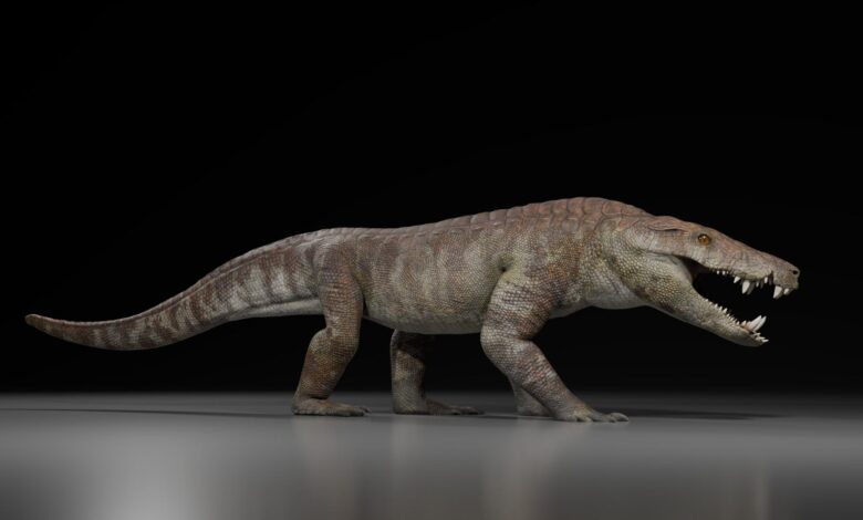 Vědci odkryli pozoruhodně dobře zachovanou fosilní kostensuchus atrox, masivní krokodýlí relativní protahování 11 stop dlouhé s čelistí. Tento lovec vrcholu se pravděpodobně živil středně velkými dinosaury, což z něj činí jeden z nejlepších predátorů své doby.