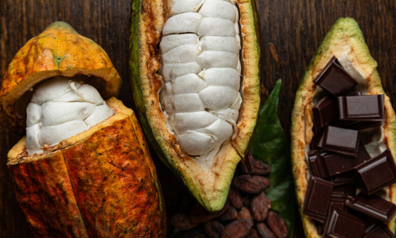 kakao: Prášek získaný z pevných látek (nikoli z tuků) ve fazolích, které rostou na Kakaovník Theobroma rostlina, známá také jako kakaovník. Kakao je také název horkého nápoje vyrobeného z kakaového prášku (a někdy i jiných materiálů) smíchaného s vodou nebo mlékem.