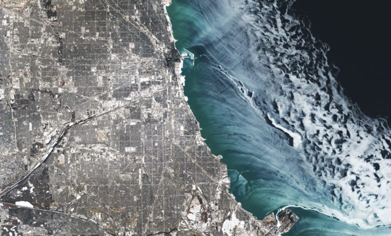Éterické ledové struktury víří podél Chicaga během extrémních mrazů poháněných polárním vírem – Země z vesmíru
