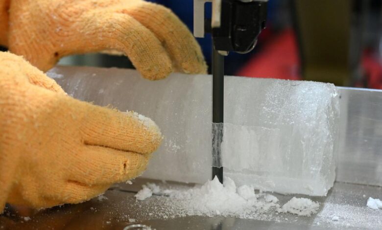 Japonský vědec Yoshinori Iizuka, oblečený v oranžové bundě, vstoupil do mrazáku, aby získal ledové jádro, o kterém doufá, že pomůže odborníkům chránit mizející světové ledovce.