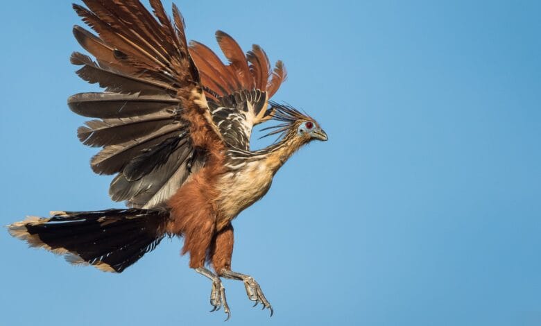 Hoatzin má několik docela podivných rysů, s mohikánskými hřebeny, modrou pokožkou obličeje, červenými očima a velkými ocasy ve tvaru ventilátoru, které používali k udržení rovnováhy při navigaci husté vegetace.