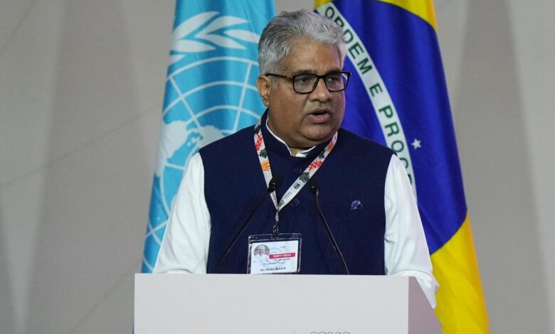 Bhupender Yadav, ministr životního prostředí, lesů a změny klimatu, během plenárního zasedání na COP30 summitu OSN o klimatu v pondělí 17. listopadu 2025 v Belemu v Brazílii. | Fotografický kredit: AP