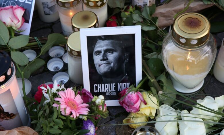Památník Charlieho Kirka mimo americké velvyslanectví v Berlíně.Adam Berry/Getty