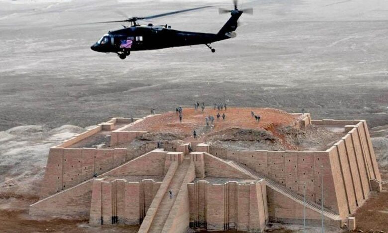 Vrtulník americké armády letí v roce 2010 nad stupňovitým zikkuratským chrámem, třístupňovou stavbou z roku 2113 př. n. l. ve starobylém městě ur v jižním Iráku. Fotografický kredit: AFP