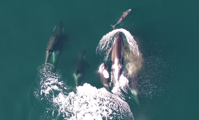 Vědci použili podvodní video, data z biologických štítků na přísavkách a záběry z leteckého dronu, aby zjistili, jak se devět kosatek žijících na severu pohybovalo a lovilo v srpnu 2020 – a jak interagovaly s tichomořskými delfíny bělobokými kolem ostrova Vancouver v Kanadě.