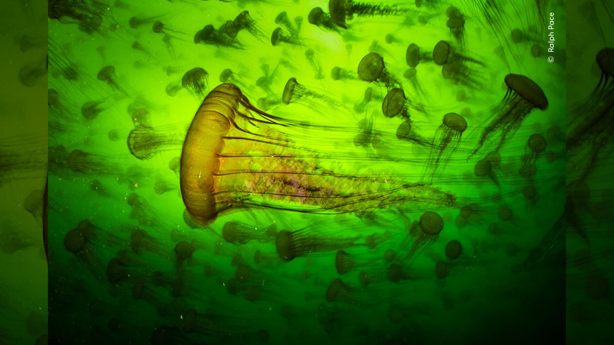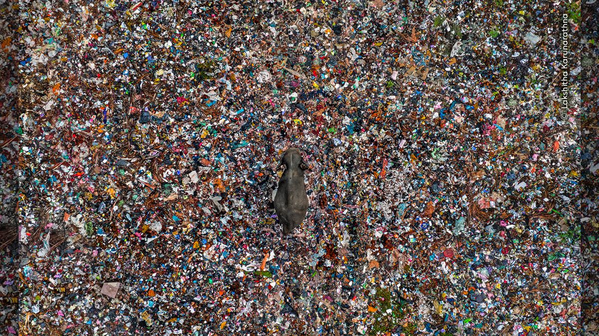 Mezi další fotografie patří obrovská masa medúzy z Kalifornie, císařských tučňáků (Aptenodytes Forsteri) chůze po okraji ledové police a slona navigace „toxického špičky“ na Srí Lance.