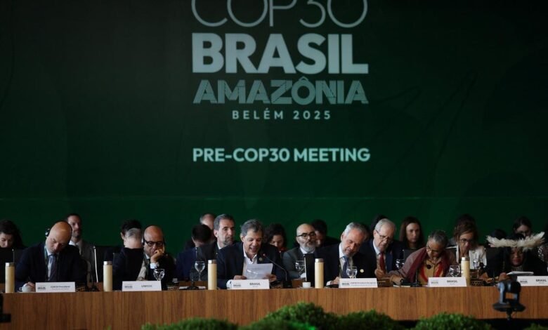 Brazilský ministr financí Fernando Haddad hovoří vedle Simona Stiella, výkonného tajemníka změny klimatu OSN (UNFCCC) a brazilského prezidenta COP30 Andre Correa do Lago během ministerského přípravného setkání (před CoP30), před summitem COP30, v Brasilii, Brazílii, 13, 2025. | Foto kredit: Reuters