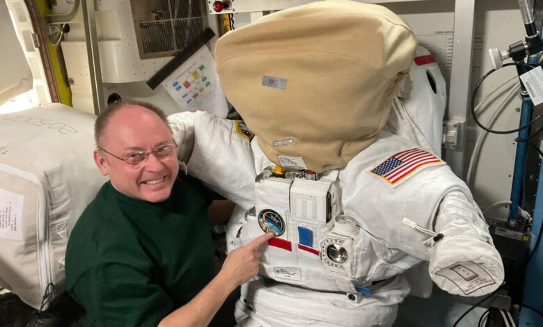 Astronaut NASA Mike Fincke pózuje v přechodové komoře Mezinárodní vesmírné stanice Quest vedle skafandru.
