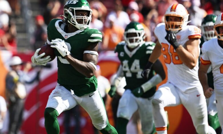 Buccaneers zvětral 14 trestů a překonal pozdní nárůst Jets (0-3), kteří vymazali 17-bodový deficit ve čtvrtém čtvrtletí, aby se ujal vedení, než Mayfield stanovil McLaughlinův pátý branku hry s dokončením 28 yardů do Emeka Egbuka a Sterling Shepard.