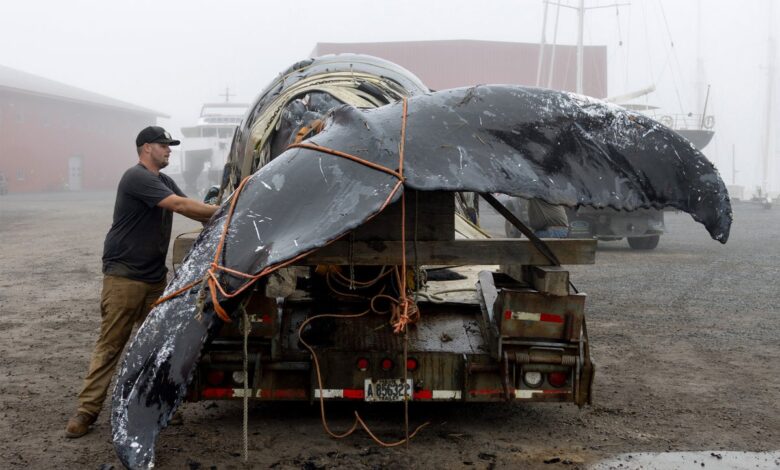 Aaron Doughty zachovává velrybu mrtvého keporkaků, která byla ve čtvrtek 6. června 2024 vyvezena z přístavu Portland na přívěs.