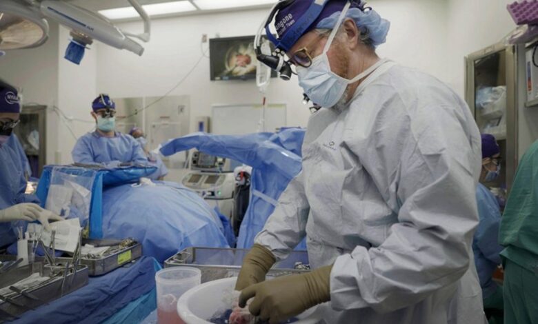 Robert Montgomery připravuje v červenci 2023 v New Yorku prasečí ledvinu k transplantaci muži s mozkovou smrtí.