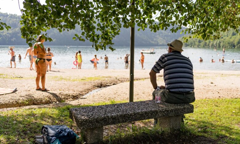 Starší muž je vidět, jak spočívá pod stromem u jezera Levico. S teplotami přesahujícími 45 stupňů Celsia v mnoha částech Itálie a požáry hořící ve Francii ve Španělsku a Portugalsku je Evropa v pohotovosti, protože tepelná vlna uchopí kontinentu.