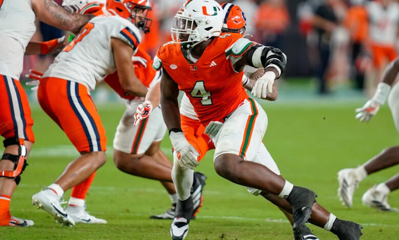8. listopadu 2025; Miami Gardens, Florida, USA; Defenzivní lajna Miami Hurricanes Rueben Bain Jr. (4) během třetí čtvrtiny na Hard Rock Stadium spěchá na přihrávku proti Syracuse Orange. Povinný kredit: Jeff Romance-Imagn Images