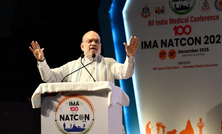 Ministr vnitra Unie Amit Shah projevy během 100. indické lékařské konference IMA Netcon 2025 v klubu 07 v Ahmedabadu 28. prosince 2025 | Fotografický kredit: Vijay Soneji