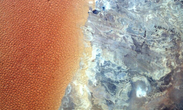 Sea of Saharan ‚Star Dunes’ se střetává s jiným světovým terénem, kde se setkávají 2 země – Země z vesmíru