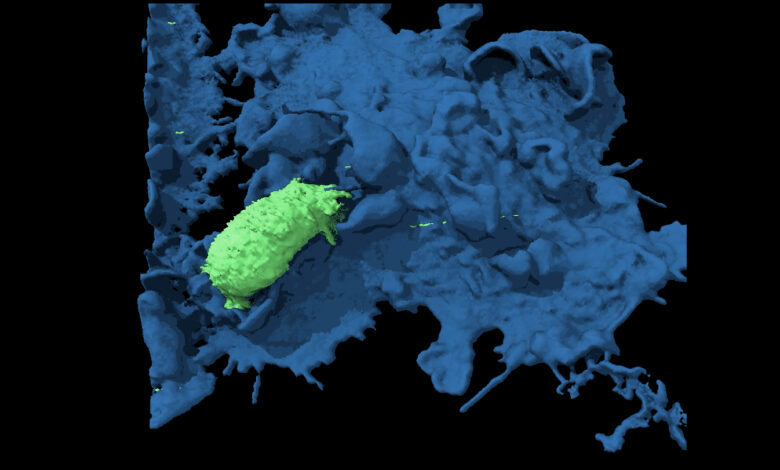 Tím, že se některé rakovinné buňky pohybují, nutí útočící imunitní buňky, aby jen okusovaly okraje, než aby je úplně pohltily.