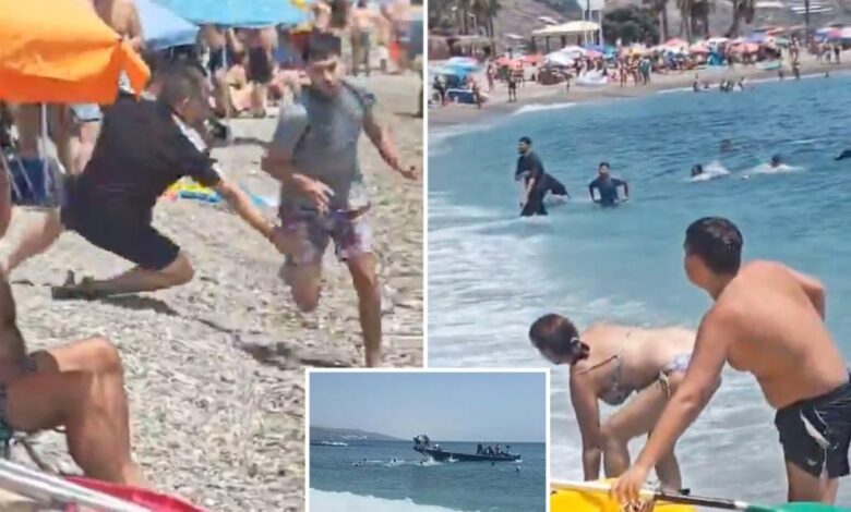 Divoké video ukazuje šokované slunečníky, kteří se zabývají tuctem migrantů, kteří vyskočili z lodi jen nohy od pobřeží zabalené pláže ve Španělsku.