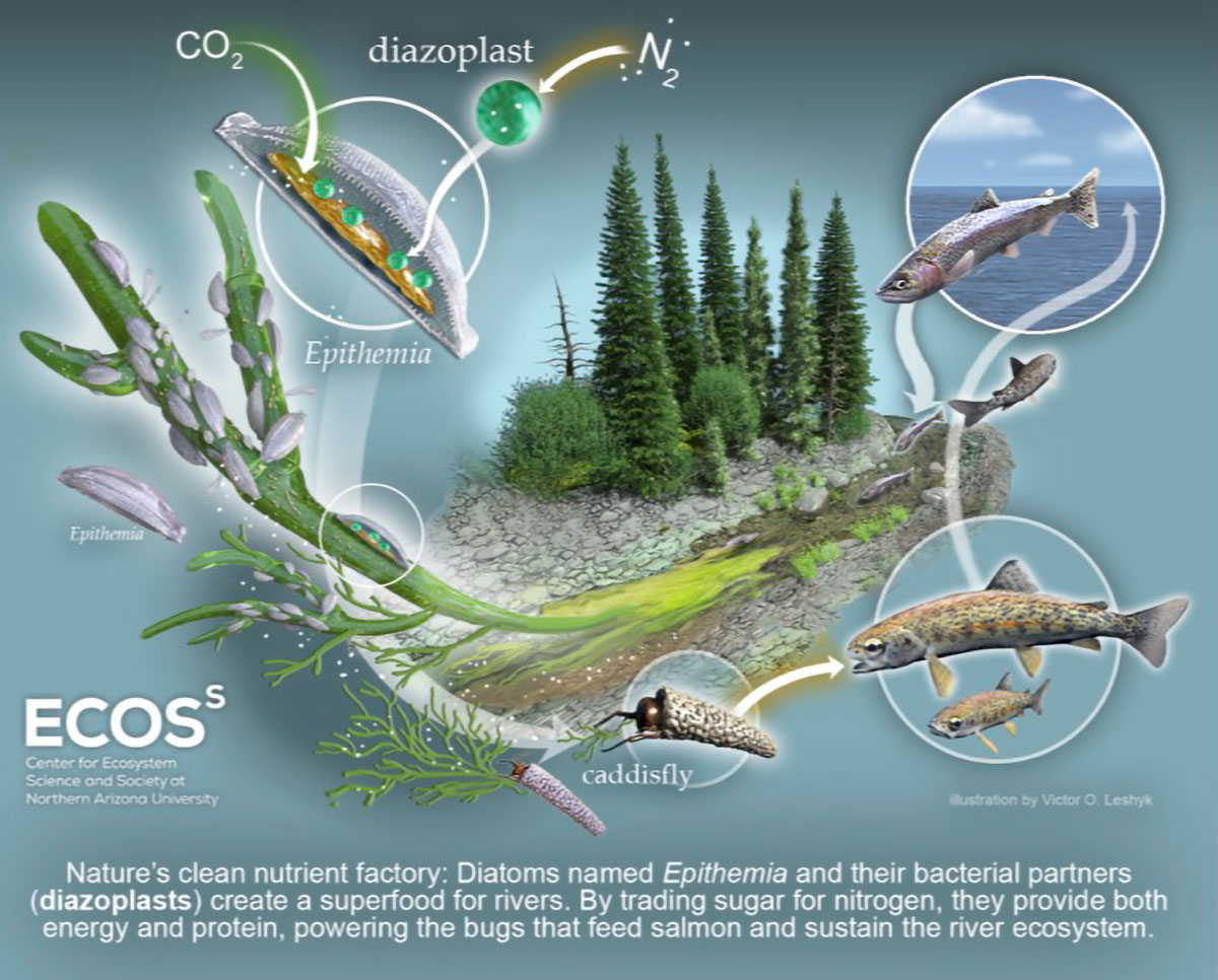 Jejich nový papír v Sborník Národní akademie věd Vysvětluje, jak řasy a bakterie spolupracují na poskytnutí čistého zdroje dusíku. Partneři přeměňují dusík ze vzduchu na jídlo, které udržuje ekosystém řeky a vyhýbá se potřebě hnojiv a znečištění, které mohou vytvořit. Tento skrytý zdroj živin zvyšuje populace vodního hmyzu, na kterém mladý losos závisí na růstu a přežití.