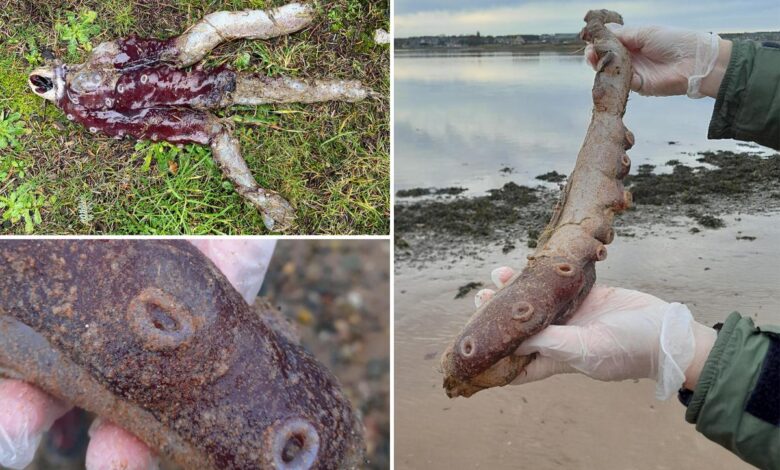 Výzkumníci byli ohromeni poté, co na břeh ve skotském Colliestonu vyplavily pozůstatky ultravzácné sedmiruké chobotnice, jak je vidět na fotografiích, které vytvářejí vlny online.