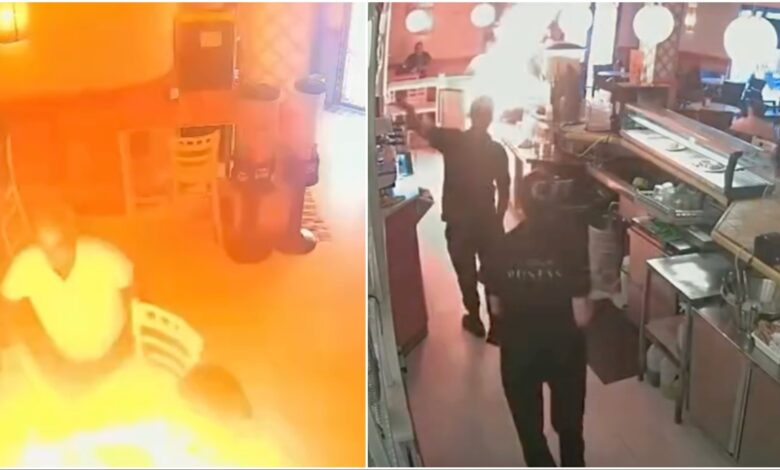 Video vydané barem ukazuje divoký okamžik, kdy klidně vejde do restaurace, jde nahoru k baru a rozprašuje přes něj tekutinu.