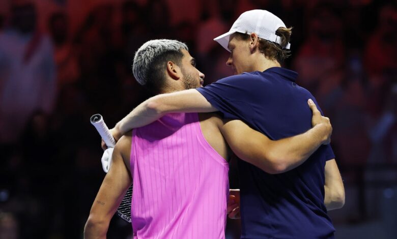 Jannik Sinner a Carlos Alcaraz se objímají u sítě