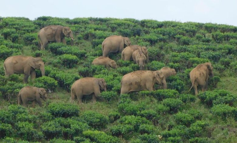 Stádo slonů v čajovém panství ve Valparai v okrese Coimbatore. | Fotografický kredit: SPECIÁLNÍ ARAGEMENT