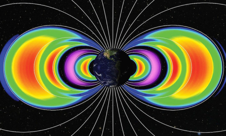 Van Allenovy pásy: Dva pásy, vnitřní a vnější, obklopující Zemi. Skládají se z kosmického záření — nabitých částic (elektronů a protonů). Pásy se rozprostírají od asi 13 000 do 60 000 kilometrů (8 100 až 37 300 mil) nad povrchem planety. Částice s vysokou energií, druh záření, se mění v čase a nadmořské výšce a představují zdravotní riziko pro exponované vesmírné cestovatele.