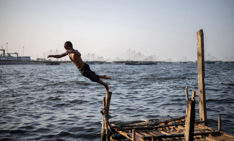 Dítě hrající si skokem do moře v severní Jakartě v Indonésii.