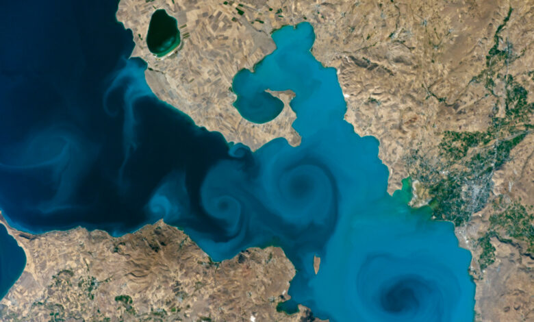 Nahoře výše ukazuje část dodávky jezera kolem města Erciş, která se nachází podél severního pobřeží jezera. Víry na obrázku vypadají velmi podobně jako tvary, které se objevují během květin řasPři rychlém vynásobení druhů planktonu se chytí v proudech řízených větrem. To však nebyla příčina těchto víření.