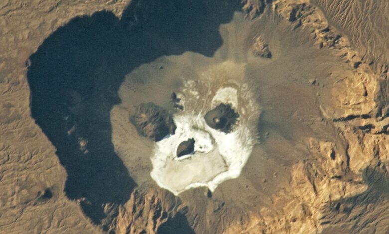 Zářící „lebka“ zírá vzhůru z obří sopečné jámy na Sahaře – Země z vesmíru