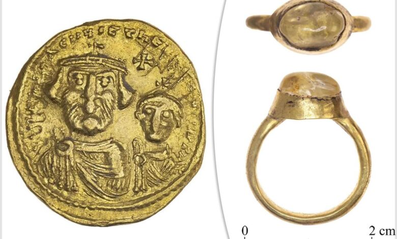 Poklad se skládal ze dvou zlatých mincí a jemného zlatého prstenu. Navzdory tomu, že místo bylo v minulosti náchylné k drancování starožitností, artefakty jako zázrakem přežily 1400 let.
