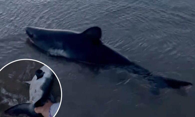 Její psi trpělivě čekali, když popadla třístopého žraloka za ocas a přinesla ho do hlubší vody, zatímco ona natáčela video na svůj telefon.