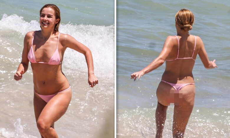 25letá dívka měla na své vyrýsované postavě malinké drobné růžové bikiny, které hravě předváděla předkláněním – dopředu a dozadu – před zraky kamer.
