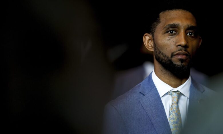 Starosta Baltimoru Brandon Scott hovoří o obraně „50letého minima“ vražd.Julia Nikhinson/ap