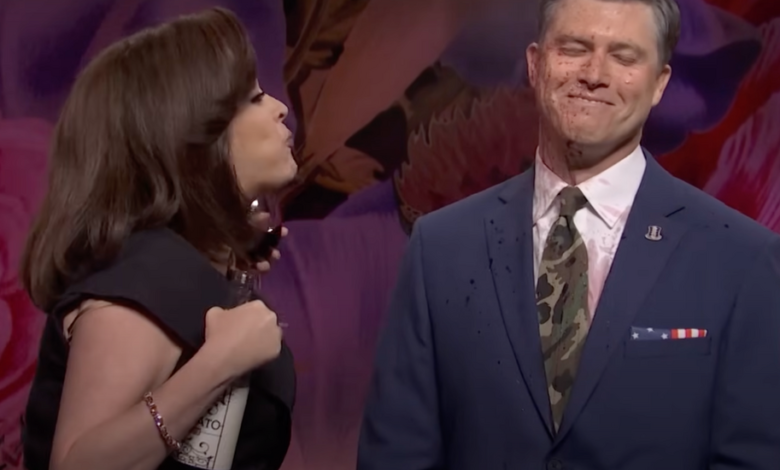 Cecily Strong se vrátil do „Sobotní noci“ v hostujícím vzhledu k reprise Její role osobnosti Fox News Jeanine Pirro – a na to, aby Colin Jost, její bývalý víkendový aktualizační stolní kamarád, v alkoholu. Alkohol, který vycházel přímo z vlastních úst.