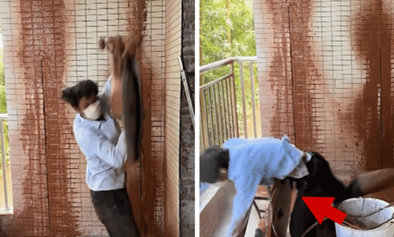 Stavební dělník v Číně se téměř uvolnil řezací pilou, když se kráčel dlaždicemi na zdi … a video ukazuje, jak štěstí má naživu.