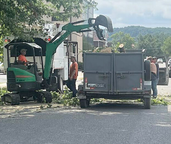 Inter-horní fotka Edgara Kelleyho skupina pracovníků s broušením pařezů TLC a stromové služby vyčistí zbytky zbývající ze stromu oříznutí společnosti nedávno dokončené na Kerens Avenue v Elkins.