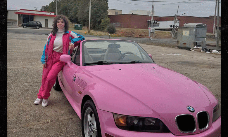 Další obrázek zachycuje Sydney v růžové teplákové soupravě, jak se opírá o své odpovídající BMW … jasně růžové číslo, které při pohledu na něj přiměje nemálo chlapů vlčí pískání.