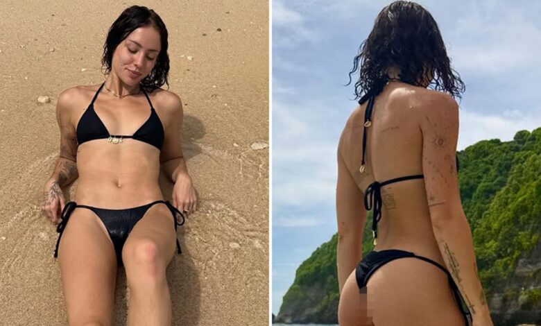 Spoře oděná modelka sdílela sérii fotek Instagram Čtvrtek ráno… ve kterém odpočívá na scénickém místě u pláže a svléká se jen do malých černých bikin.